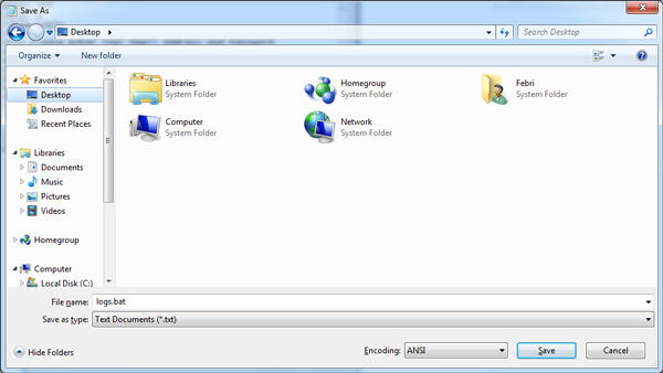 - Simpan dengan nama Logs.bat di dekstop kamu