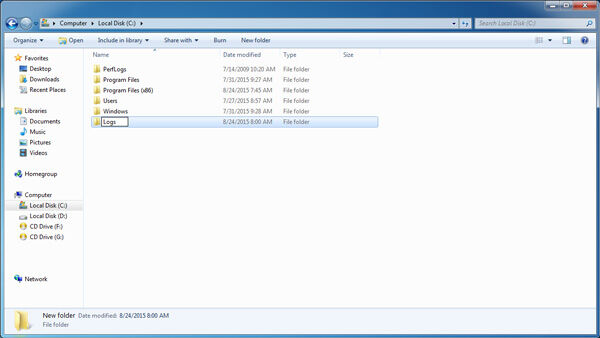 - Buat sebuah folder baru di drive C:\ dengan nama Logs, karena fungsi ini hanya bisa berjalan jika ada folder Logs di drive C
