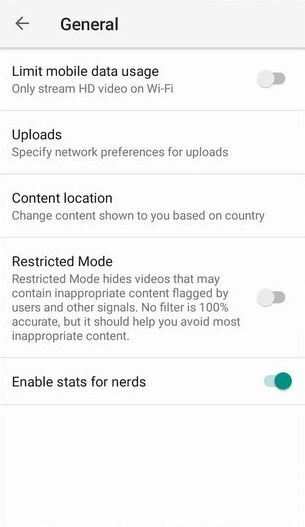 Dengan mengaktifkan tombol statistik, kamu dapat melihat dan mendapatkan info sekitar video. Kamu dapat menemukan YouTube pada Settings lalu General dan pilih Enable Stats For Nerds. Sekarang kamu dapat melihat statistik video dengan bundle informasi di Android kamu.